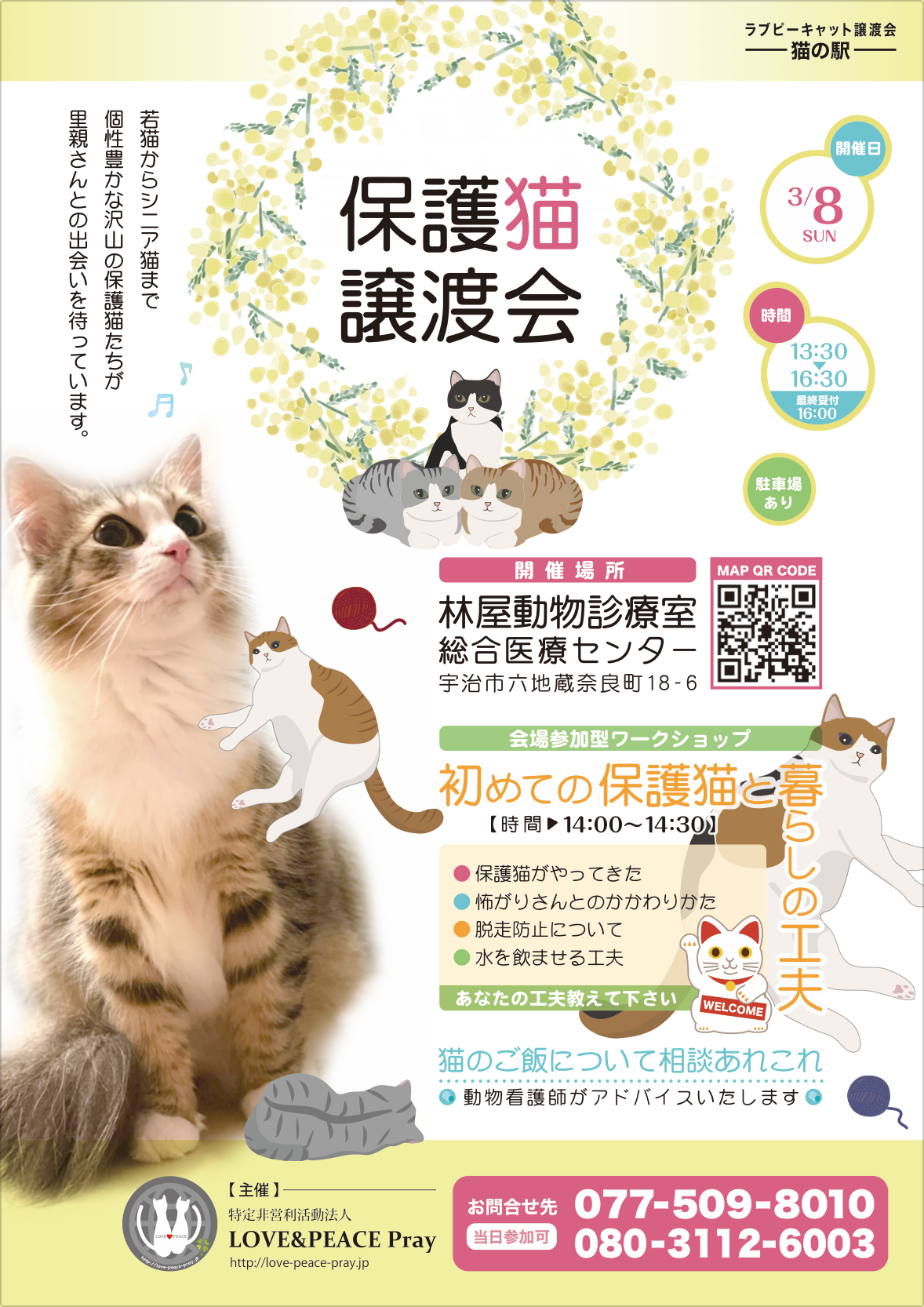 LOVE & PEACEでは、毎月最終日曜日(11:00〜16:00)、猫たちが暮らすシェルターでの譲渡会「猫の駅」を開催いたしております。